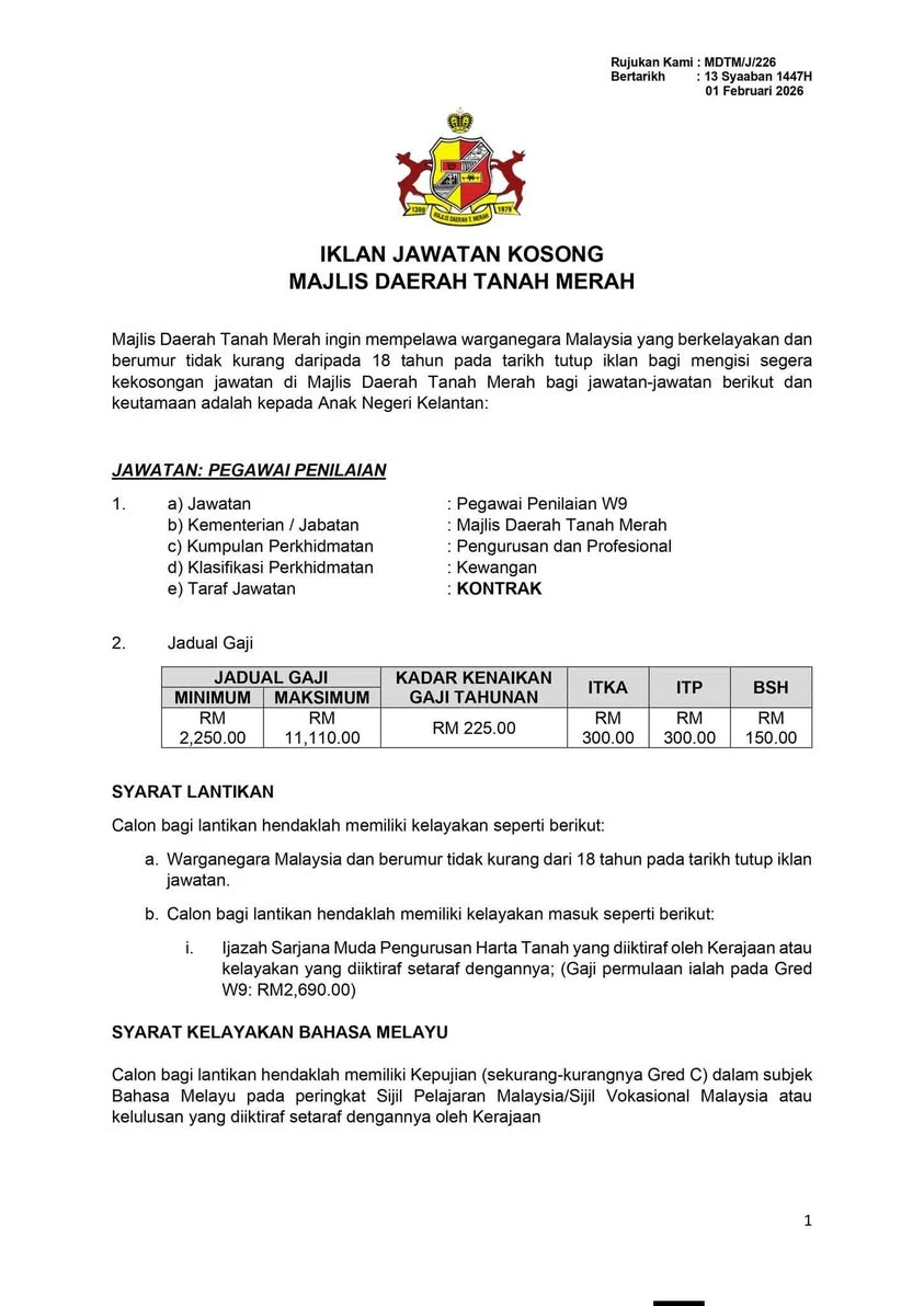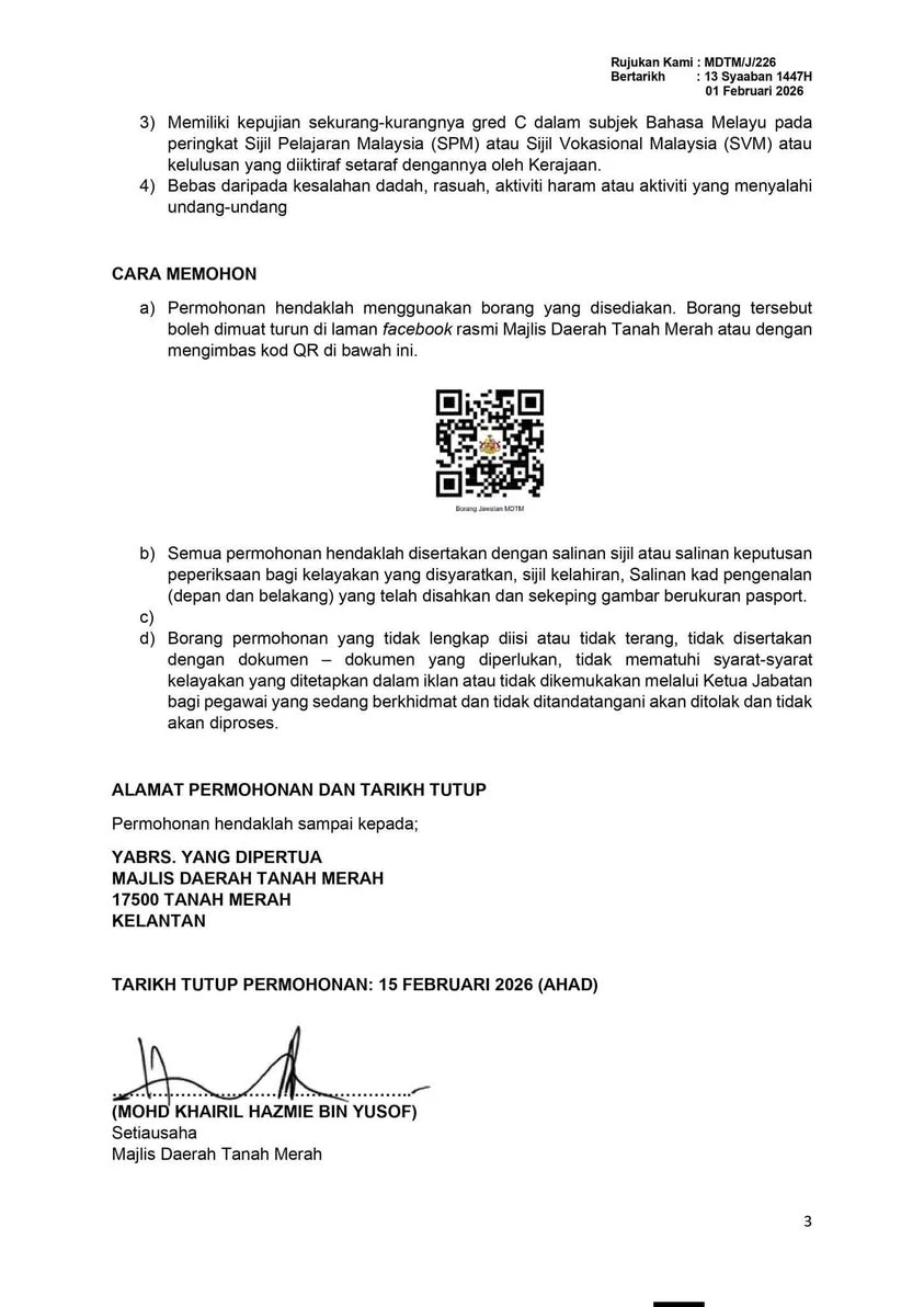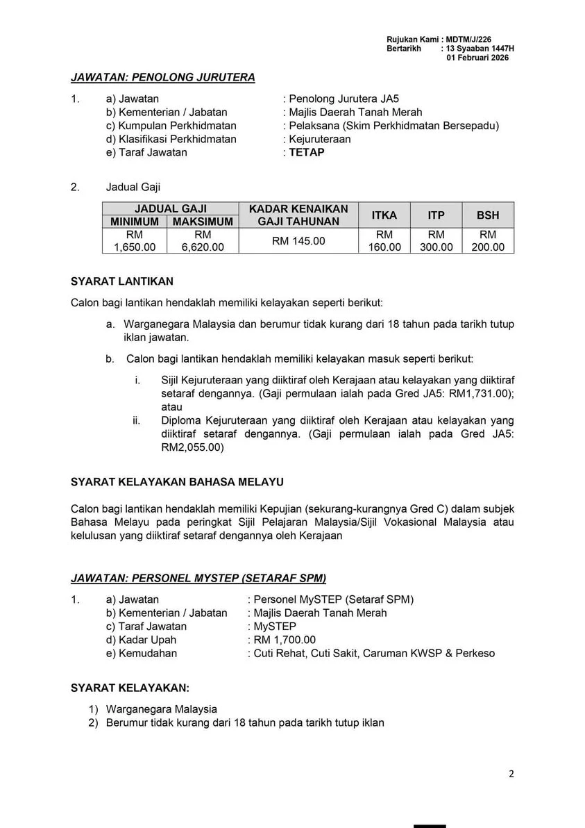 📋 Jawatan Kosong Majlis Daerah Tanah Merah (MDTM) 2026