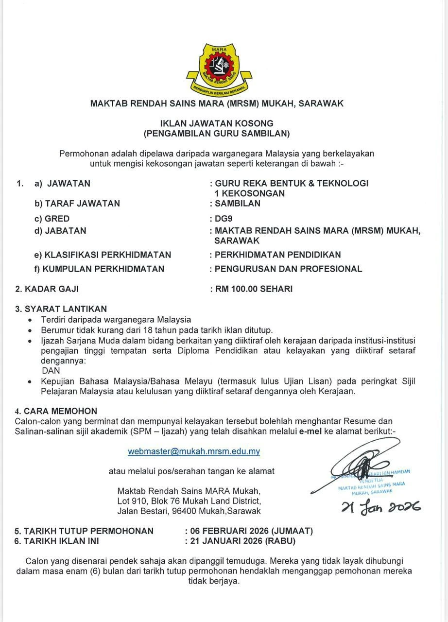 📋 Jawatan Kosong Maktab Rendah Sains Mara (MRSM) Mukah 2026
