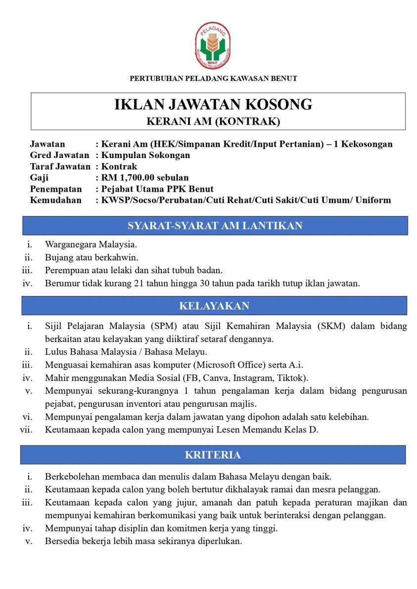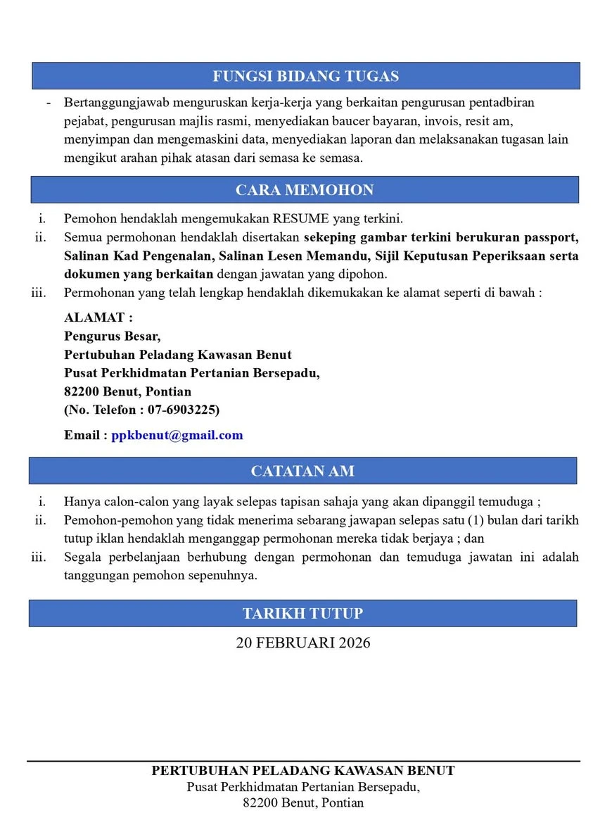 📋 Jawatan Kosong Pertubuhan Peladang Kawasan Benut 2026