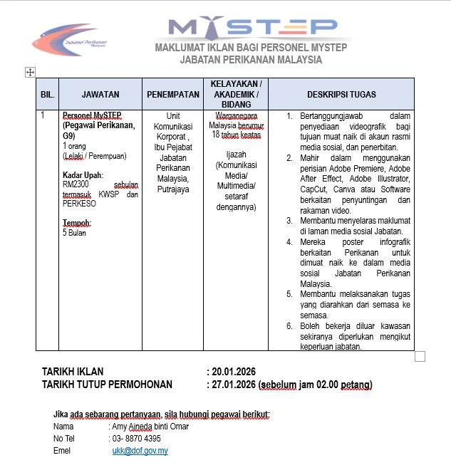 Jabatan Perikanan Malaysia kini membuka kekosongan jawatan MySTEP 2026. Peluang menyertai Program Penggajian Jangka Pendek Malaysia (MySTEP) di sektor awam.