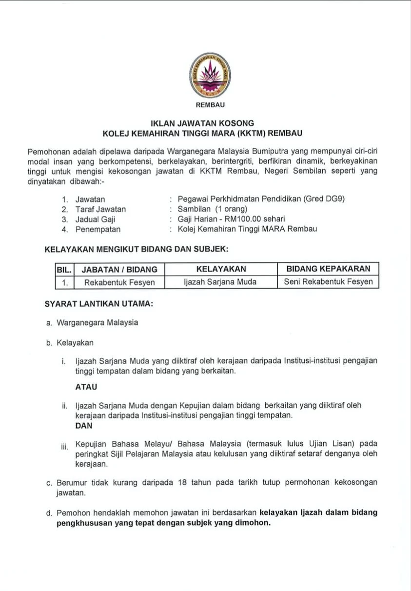 📋 Jawatan Kosong Kolej Kemahiran Tinggi MARA (KKTM) 2026
