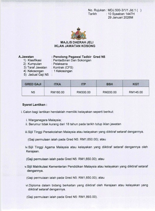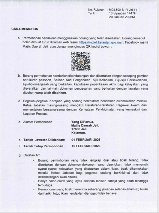 📋 Jawatan Kosong Majlis Daerah Jeli (MDJ) 2026