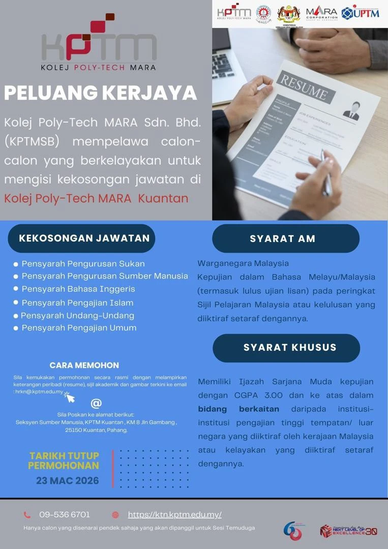 📋 Jawatan Kosong Kolej Poly-Tech MARA (KPTM) Kuantan 2026