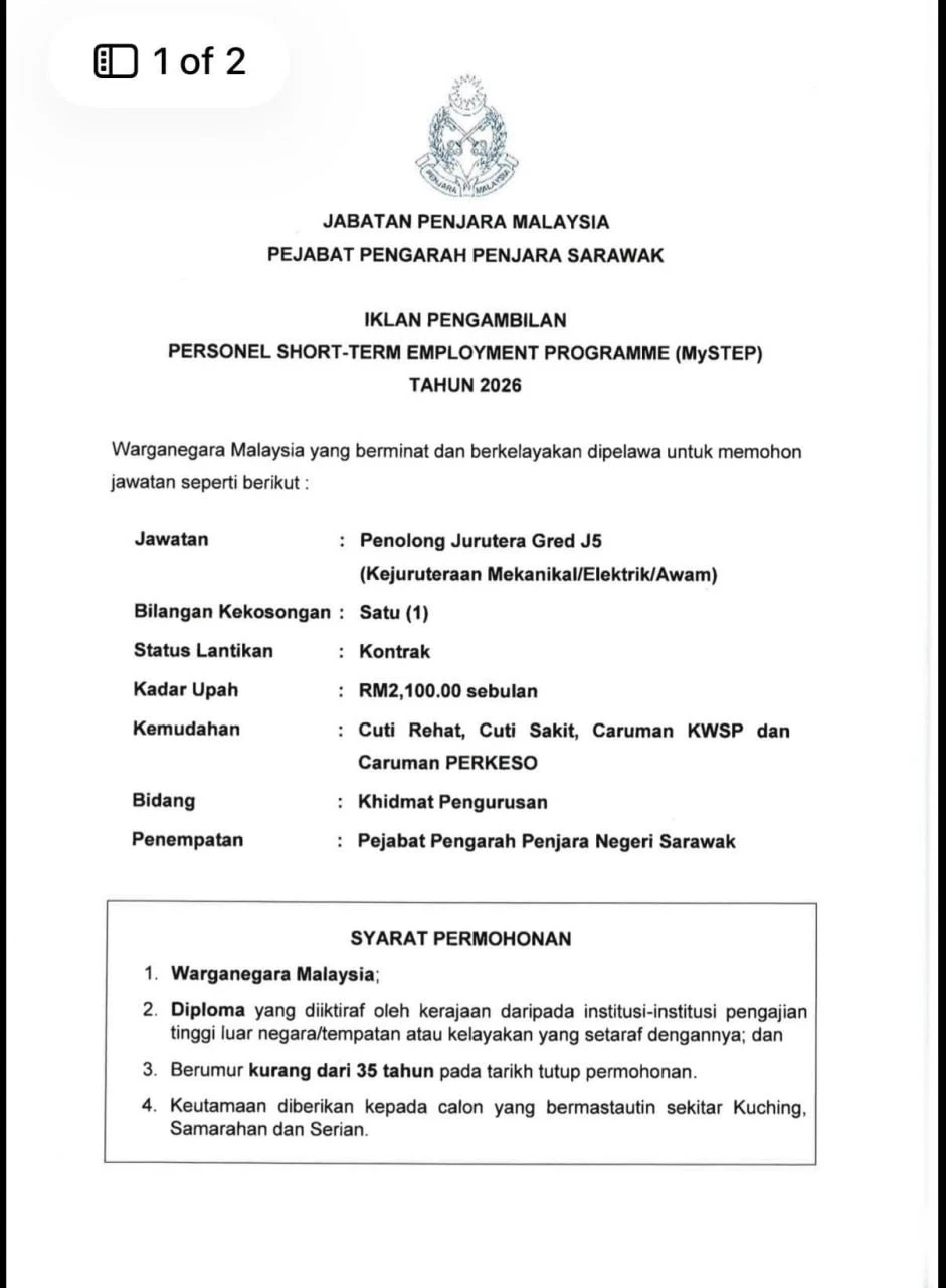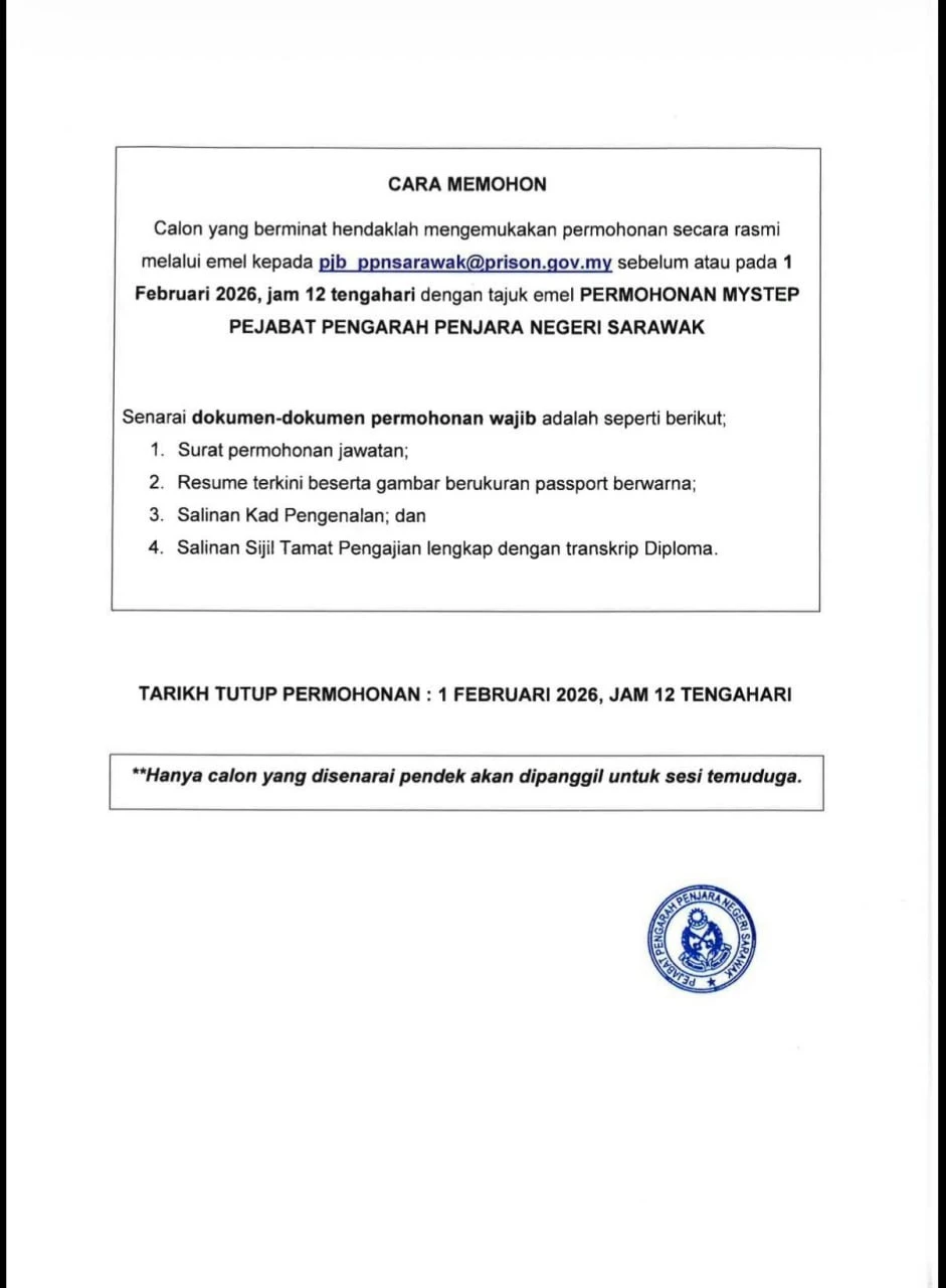 Jabatan Penjara Malaysia kini membuka kekosongan jawatan MySTEP 2026. Peluang menyertai Program Penggajian Jangka Pendek Malaysia (MySTEP) di sektor awam.